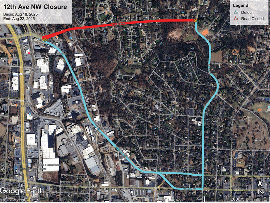 Hickory – Starting on Monday, Aug. 18, 12th Avenue NW will be closed from Old Lenoir Road NW to Sixth Street NW to repair damaged storm drain infrastructure. The detour route will be clearly marked. Please slow down and exercise caution when traveling through this area so crews can return home safely each night. The road should reopen by end of day Fri., Aug. 22.