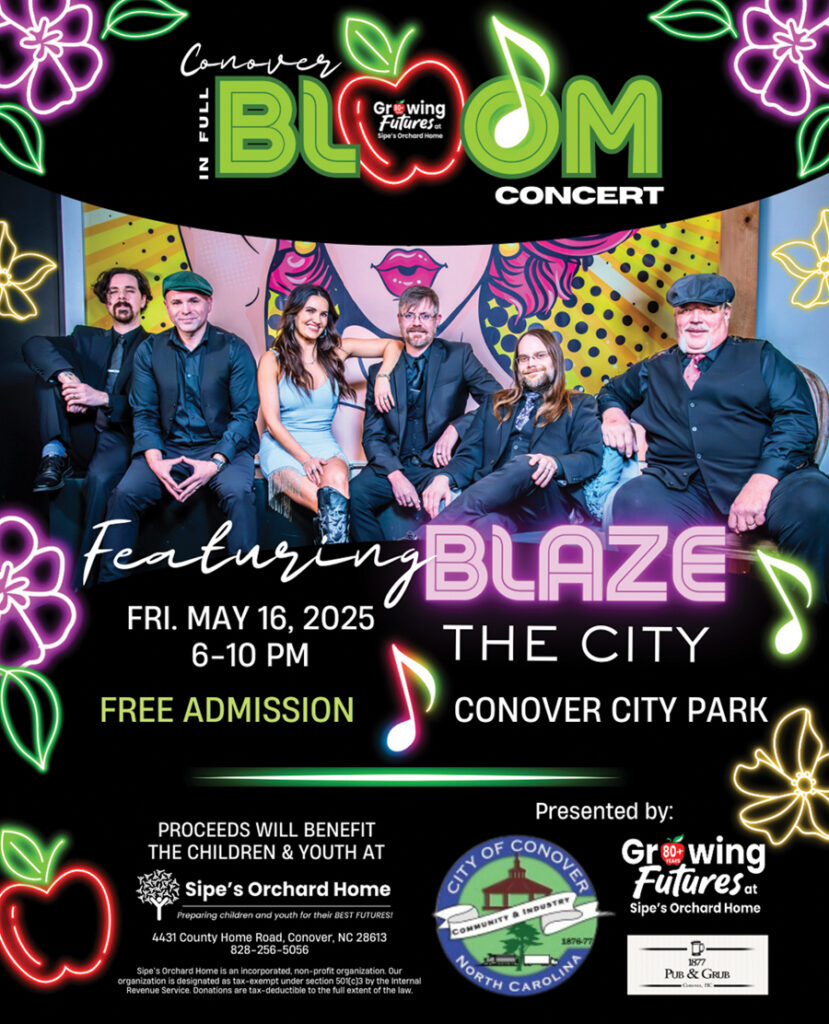 Conover, NC – The City of Conover invites the public to gather for a night of high-energy music, local unity, and heartfelt giving at the Conover in Full Bloom Concert on Friday, May 16, 2025, at Conover City Park.