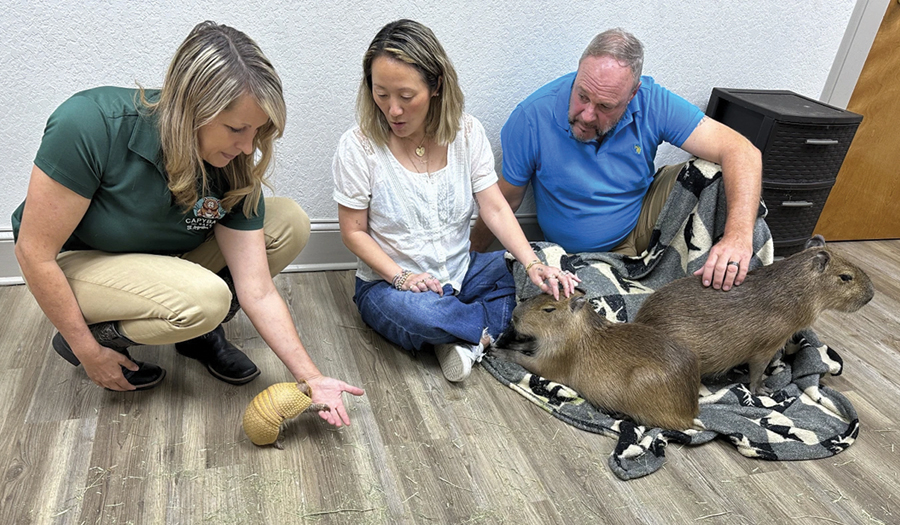 After entering a reception area with couches and an open pen of baby chicks, visitors are escorted into a smaller room in groups of a half dozen or so people. Blankets are placed over their laps, and three capybaras are brought into the room. Other animals like a skunk, wallaby and armadillo are also introduced into the room, and they crawl among the humans and into their laps. The cost is $49 per person for a half-hour encounter, and $99 for an hour-long encounter that involves the other animals.
