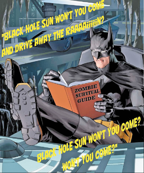 Dark restless knights aside, what is relaxing? Doing something that makes you less tense or anxious which would mean doing something that makes you happy, I suppose. In doing so your mind would be free from worries and doubt and you’d just… relax? Hmmm, now what activity do I have that can be done alone (because I am right now), eases my mind and makes me happy? Oh I know writing! This means YOU have been here interfering with my only relaxation resource this whole time! How dare you! Why deny me this,mine only break from the rigors of this world? Well that means there’s only one thing left to do… put on my Batman suit, grab a good book, kick up my feet and crank up Soundgarden.
