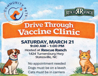 Statesville, NC – In partnership with Community Pets Mobile Clinic, Rescue Ranch will host a low-cost vaccine and microchip drive through clinic Saturday, March 21. Located at 1424 Turnersburg Hwy., Statesville. The clinic will run from 9 a.m. – 1 p.m.