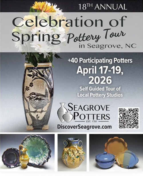 Seagrove, NC – Seagrove Potters 18th Annual Celebration of Spring Pottery Tour-Spring Kiln Openings: April 17, 18 and 19,  10am – 5pm.  Visit studios, meet potters, and expand your pottery collection.  Online shopping will be available with some studios, as well.