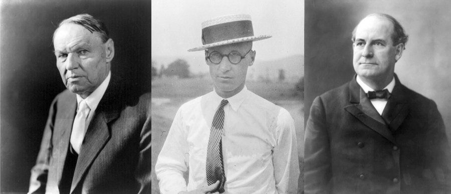 The local prosecution got a boost from one of the most important political figures of the day, William Jennings Bryan. Back in 1896, he won the Democratic nomination for president at age 36, the youngest ever to do so. He pleaded eloquently for the rights of working Americans to have their interests represented in the national economy. He lost that election, as well as subsequent tries in 1900 and 1908, but he remained a powerful political leader. Bryan served as Secretary of State in Woodrow Wilson’s cabinet, an advocate of peace when the nation went to war in 1917. He quit rather than watch his country sacrifice American lives in a European conflict.